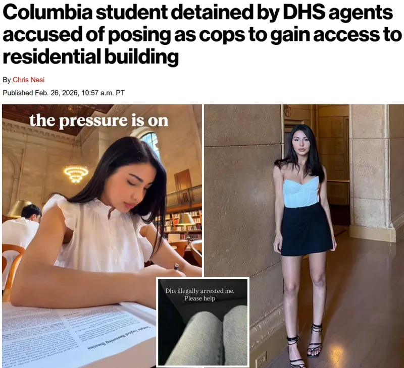 2月26日,美国国土安全部(DHS)官员将一名哥伦比亚大学留学生拘捕,引发外界质疑。校方称,这些联邦执法人员冒充警察——甚至佩戴假徽章——以获取了进入校园宿舍的权限。