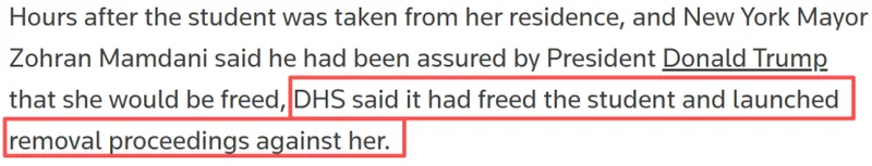 但根据国土安全部发布信息,该学生虽已获释放,但已启动遣返程序。