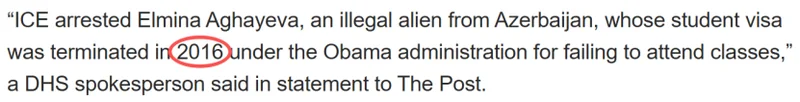 美国国土安全部发言人发表声明称:“ICE逮捕了埃尔米娜·阿加耶娃,她是一名来自阿塞拜疆的非法移民。她的学生签证已于2016年在奥巴马政府时期因未按规定上课而被终止。”