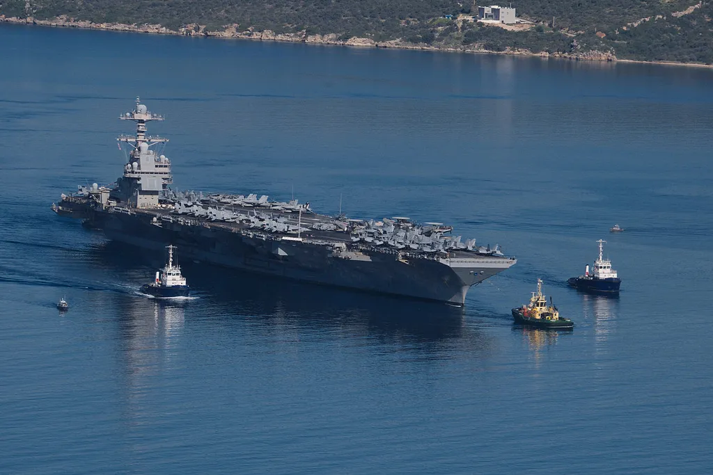 当地时间26日,美国“福特”号航母驶离希腊克里特岛并前往以色列附近海域。(视觉中国)