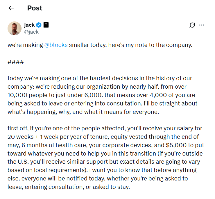 Jack Dorsey的金融科技公司Block宣布裁员约4000人,削减近半数员工,以人工智能驱动效率提升为由完成一次彻底的组织重构。