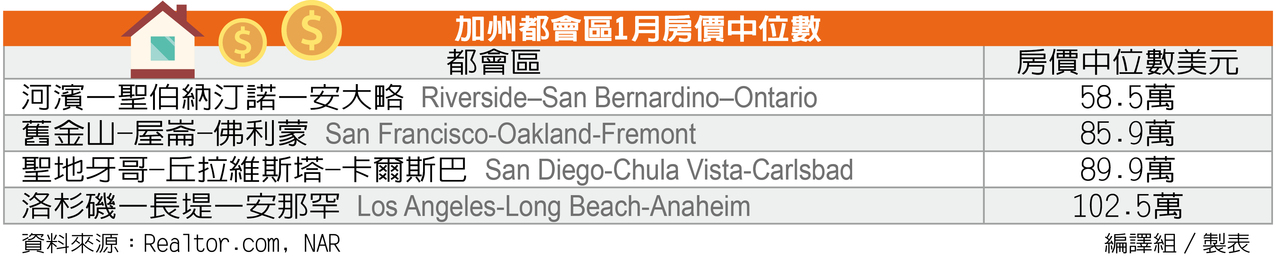 加州都会区1月房价中位数 资料来源:Realtor.com, NAR 编译组/制表