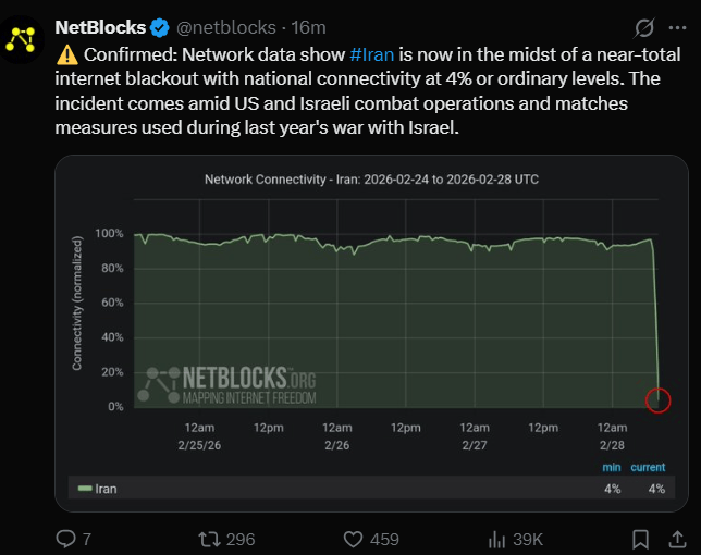 全球网络监测平台Netblocks数据显示,伊朗目前近乎全面断网,全国网络连接率仅为正常水平的4%。