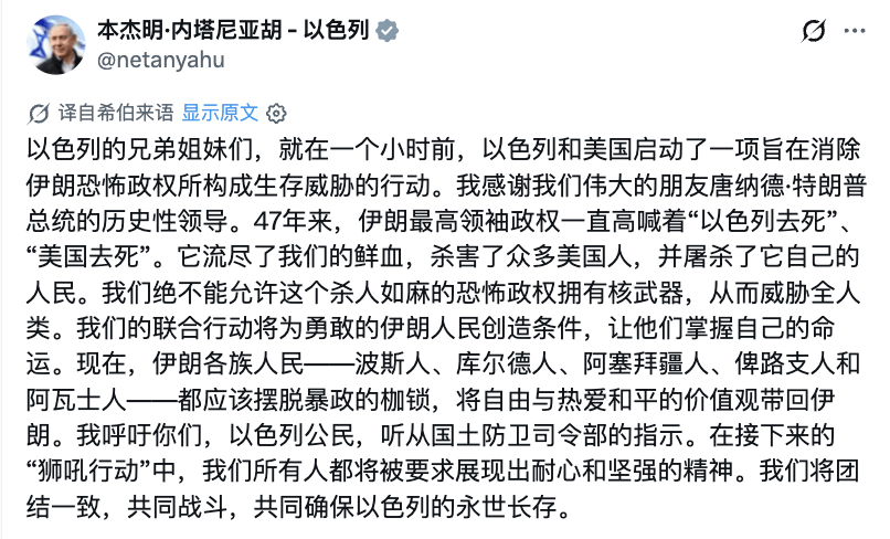 以色列总理内塔尼亚胡发表全国讲话。他宣布,美国和以色列发动军事行动的目标是推翻伊朗政权。
