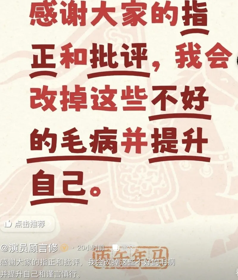 红星新闻记者留意到,涉事的“演员顾言修”账号已于2月26日晚间发布致歉内容:“感谢大家的指正和批评,我会改掉这些不好的毛病并提升自己。”