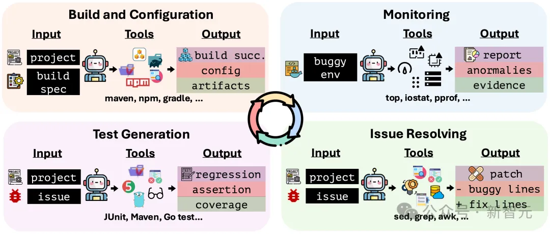 在真实世界中,一个代码变更的生命周期是漫长而痛苦的: 你需要搞定复杂的构建环境(Build & Config); 你需要将代码部署上线,并盯着仪表盘监控它是否导致了内存泄漏(Monitoring); 当警报响起,你需要从日志中定位问题并修复(Issue Resolving); 最后,你还得补上回归测试,确保问题不再复发(Test Generation)。