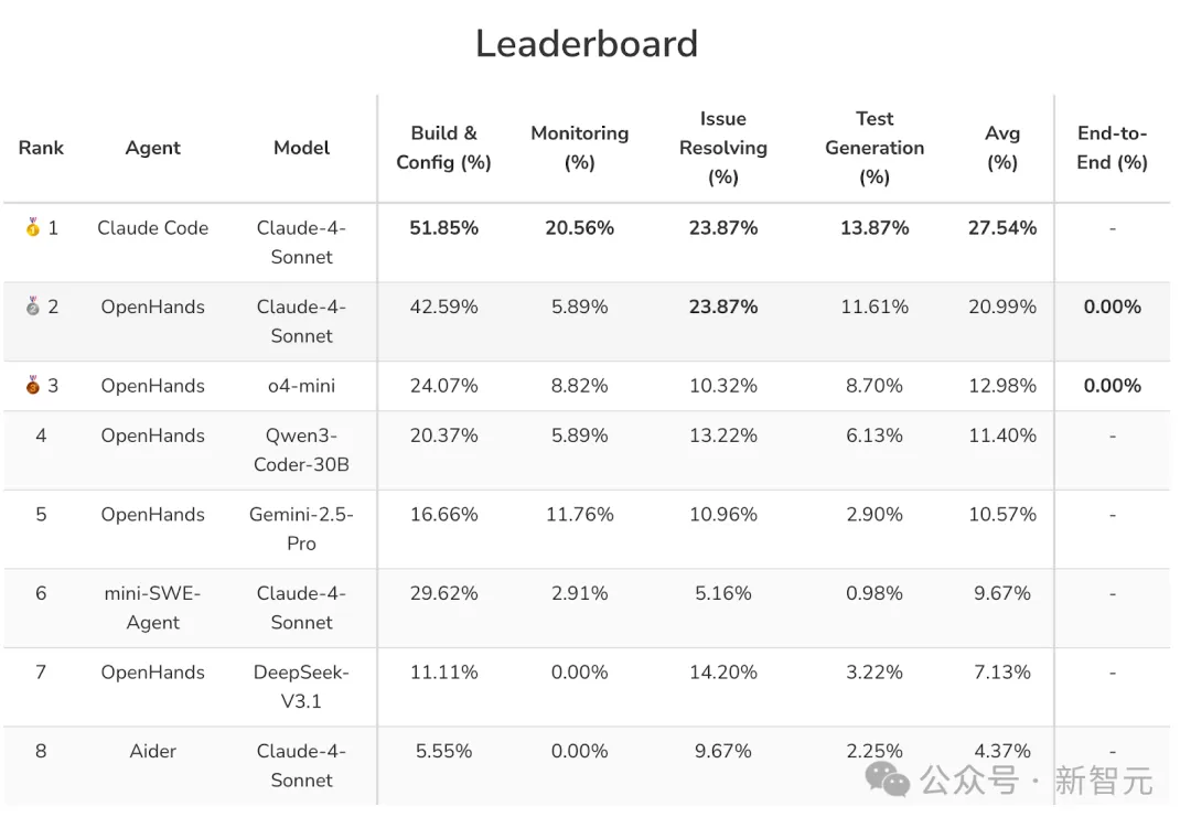 实验表明,即使是SOTA模型(如Claude-4-Sonnet),在构建与配置任务上的成功率仅为51.85%,监控任务仅为20.56%,而在全链路流水线任务中成功率更是为0%,揭示了当前AI在处理动态系统与长链路推理上的显著短板。