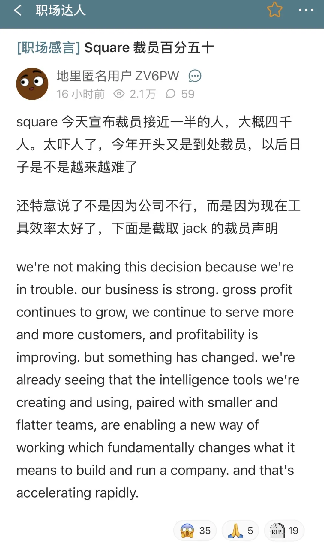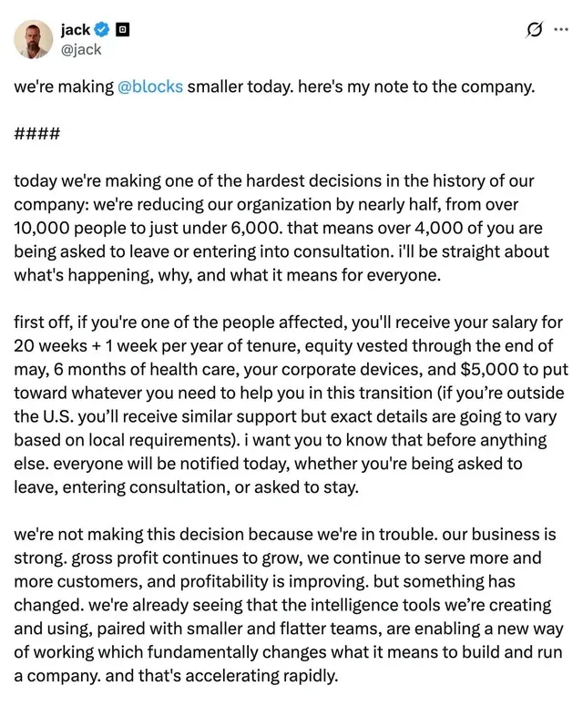 Block旗下拥有Square和Cash App。这不是一家陷入衰退的公司。Dorsey在给全体员工的信中写道,公司业务依然强劲,客户在增长,盈利能力在改善。但“有些事情已经发生了变化”。他指出,正在创造和使用的智能工具,配合更小、更扁平的团队,正在从根本上改变建立和运营一家公司的方式,而且这种变化正在迅速加速。