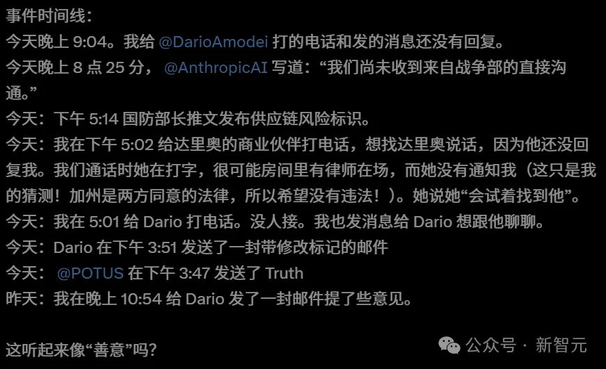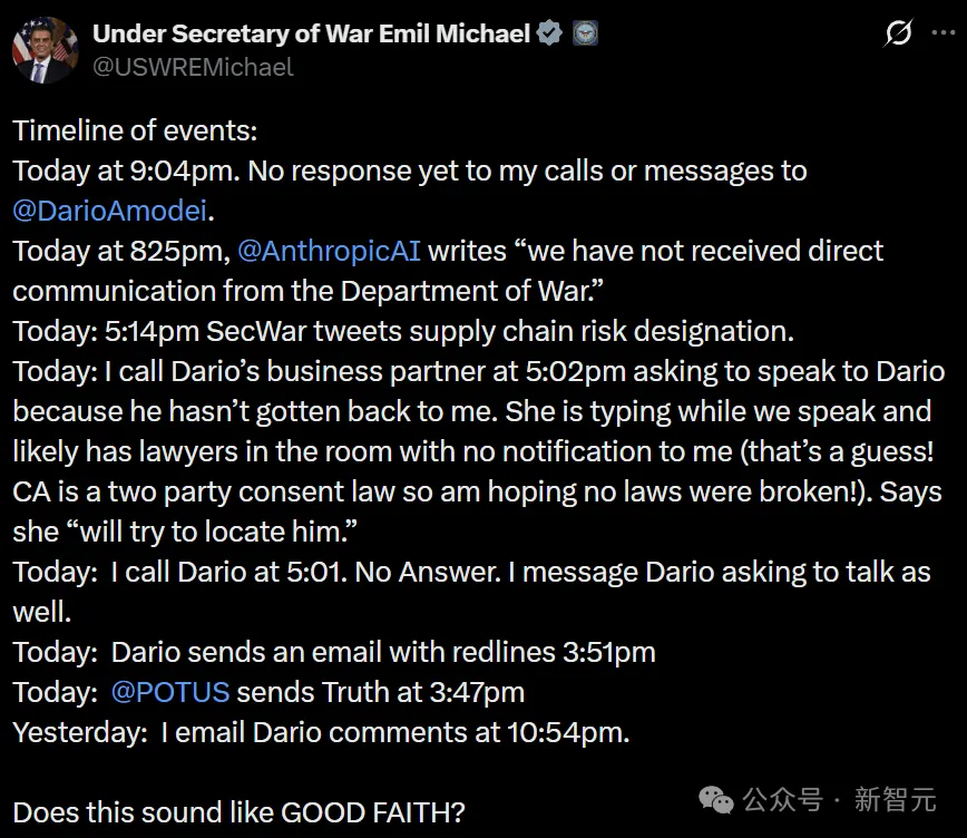 紧接着,美国国防部长Pete Hegseth在X上公开喊话,指示将Anthropic列为「供应链风险」。