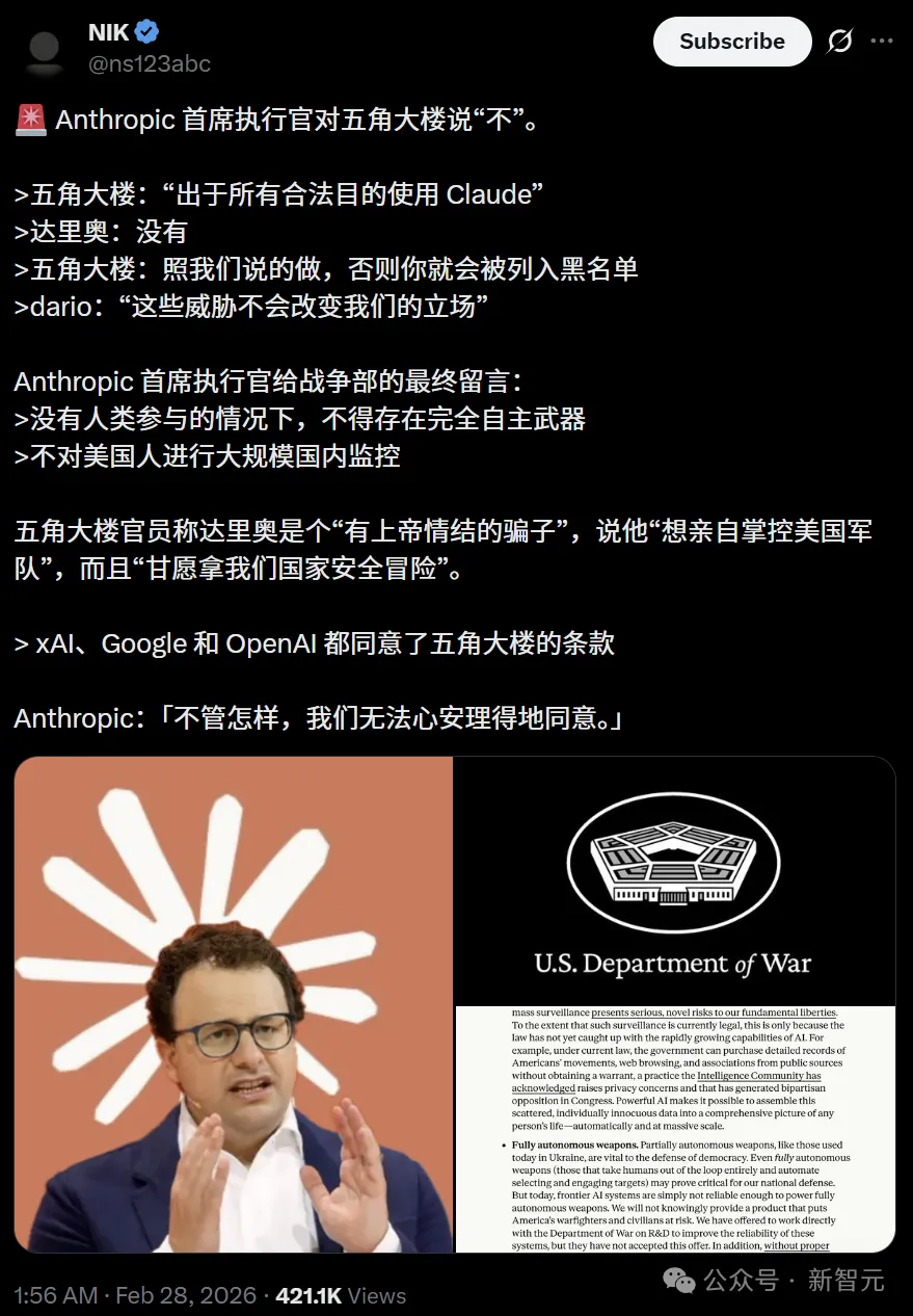 Dario Amodei公开回应:我们的良知决不允许向这些要求妥协。