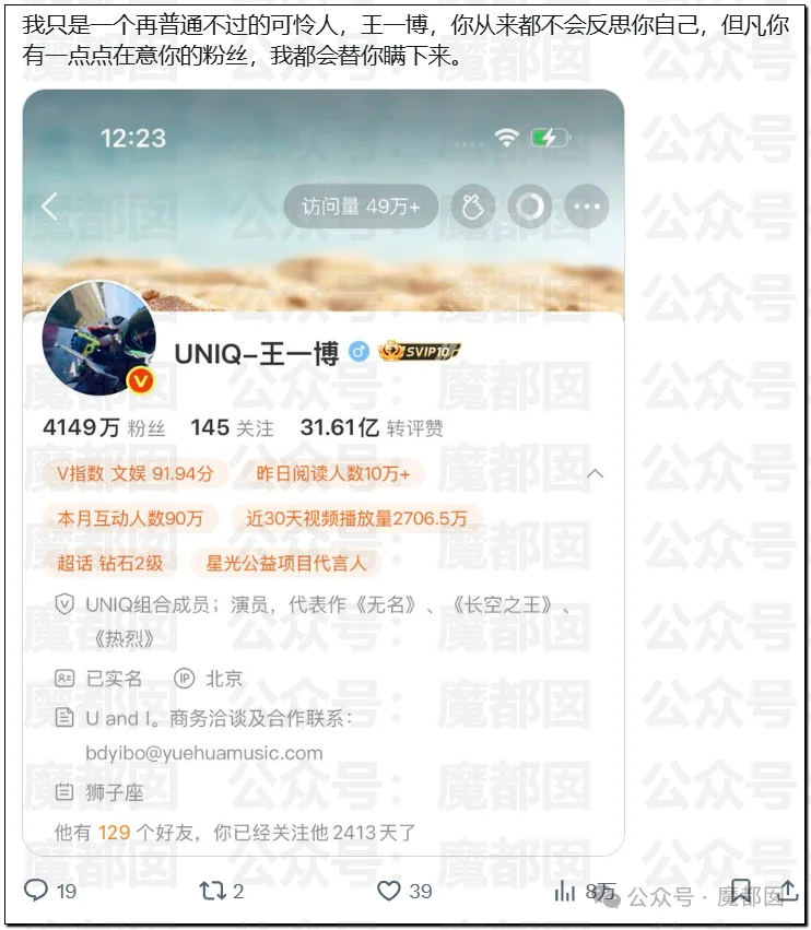 因为这个事情王一博公司已经辟谣,所以我们接下来贴的所有图都会打水印。这是最早大家在网上发现的,一开始还不知道她说的是谁: