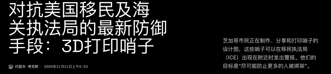 而针对最近ICE的执法行动,美国人民团结一致利用3D打印技术吹响了反抗强权的第一哨。