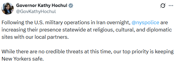 纽约州州长霍楚尔表示,州警正在全州范围内加强对宗教、文化和外交场所的警力部署。她在社交平台X上写道:“尽管目前没有可信威胁,但我们的首要任务是确保纽约民众的安全。”