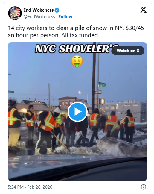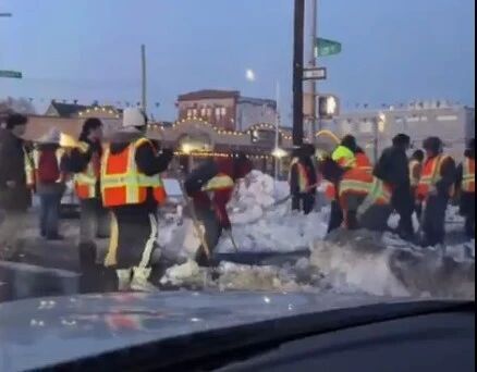 在这段视频中,大约14名市政工作人员挤在一起,似乎都在铲同一堆雪。视频时间很短,没有背景说明,也无法得知他们已经工作多久、街道其他区域的情况如何,或附近是否有大型设备。画面中只看到所有人围着同一堆积雪在工作,仅此而已。在缺乏背景信息的情况下,网络上的人们纷纷根据有限的画面作出各自判断。