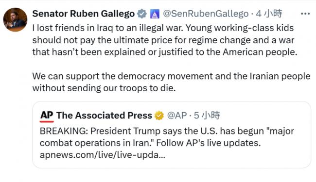 民主党参议员Ruben Gallego也在X上谴责行动,强调美国“可以在不派兵送死的情况下,支持伊朗的民主运动与人民”。参院少数党领袖Chuck Schumer则警告,政府必须向美国人民清楚交代理由,“这事很严重”。参院多数党领袖John Thune也表示,采取任何军事行动前,都应与国会充分协商。
