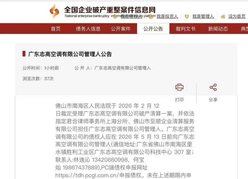 2月13日,佛山市南海区人民法院正式发布公告,将启动广东志高空调有限公司破产清算程序,这家曾跻身空调行业“四小龙”的老牌企业,终究还是要告别江湖。