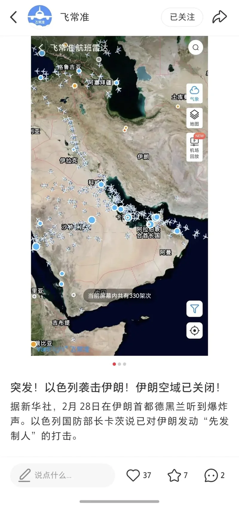 另据飞常准APP官方账号消息,据新华社,2月28日在伊朗首都德黑兰听到爆炸声。以色列国防部长卡茨说已对伊朗发动“先发制人”的打击。以色列国防部长卡茨宣布全国立即进入紧急状态,他称,以色列对伊朗发动了先发制人的打击,以消除对以色列的威胁。目前根据NOTAM伊朗空域已关闭。部分受到影响的航班已备降或返航。