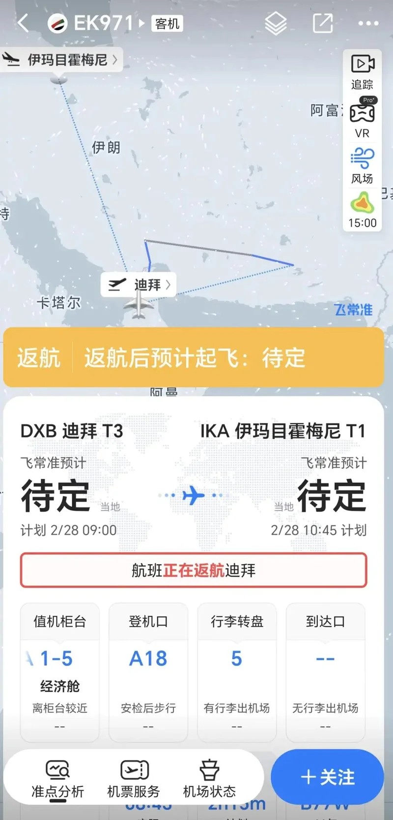 极目新闻记者搜索发现,当天阿联酋航空EK971次航班因受到伊朗关闭领空影响返航,航班原计划于2月28日当地时间9时从迪拜机场起飞,当地时间10时45分到达伊朗伊玛目霍梅尼机场,目前返航后预计起飞时间待定。