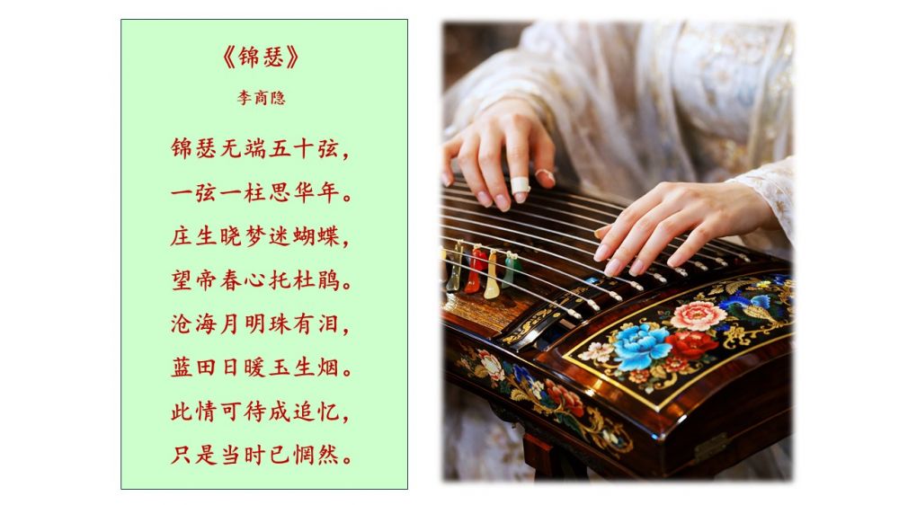 首联“锦瑟无端五十弦,一弦一柱思华年。”瑟是一种古代拨弦乐器,“锦瑟”是指经过彩绘等工艺制成的华美的瑟。瑟本有25根弦,可诗人为什么说是“五十弦”呢?原来据《史记·封禅书》记载,太昊伏羲氏(泰帝)让仙女素女弹奏50根弦的瑟。 次句“一弦一柱”中,“柱”即音柱,俗称码子。在古琴、瑟等弹拨乐器中,用于支撑琴弦并调节音高。