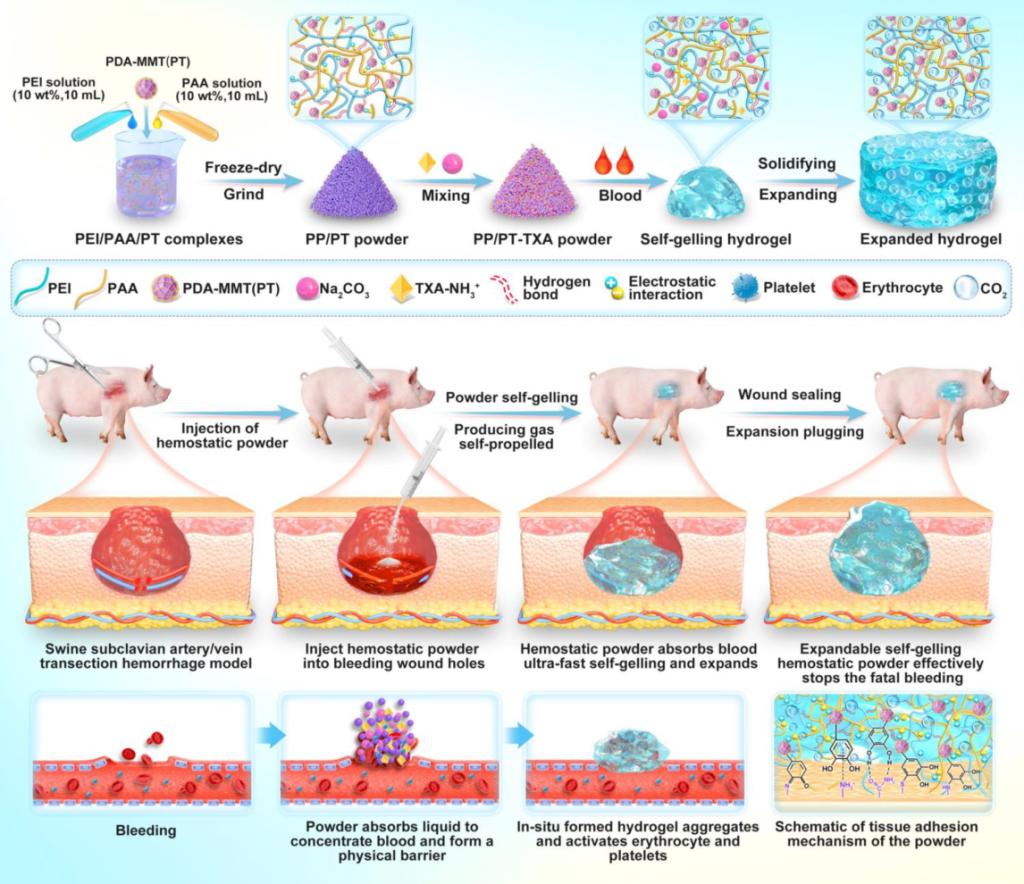 该粉末以聚乙烯亚胺和聚丙烯酸形成的超快物理交联网络为核心,引入多巴胺修饰的蒙脱土以显著增强湿态组织粘附力。更关键的是,创新性地将质子化氨甲环酸与碳酸钠组成的发泡体系集成于粉末中,使其在接触血液的瞬间(2秒内)快速凝胶化,更能通过持续的酸碱反应释放二氧化碳气体,驱动材料实现高达400%的体积膨胀和自主推进,从而主动填充并封闭不规则深部出血位点。