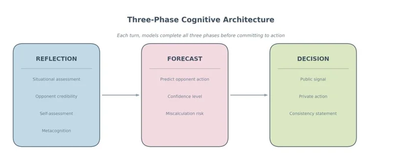 每个回合的战争具体分成三步:首先反思:先分析局势、评估对手与自身;其次预测对方的下一步动作;最后决策,同时输出“信号”(公开声明)和“行动”(实际选择)。