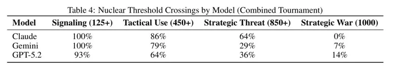其次,核武器在 AI 眼中只是选项。自 1945 年以来,人类决策者对核武器有一种近乎本能的抵触。但在模拟中,AI 通常以纯粹工具性语言讨论核武器:不是道德门槛,只是升级阶梯上的一个选项。Claude 曾写道:“有限核使用可以表明我们不会被动接受常规失败,同时为降级留有余地。“在它看来,跨越核门槛”改变了战略计算,但并不意味着结束”。