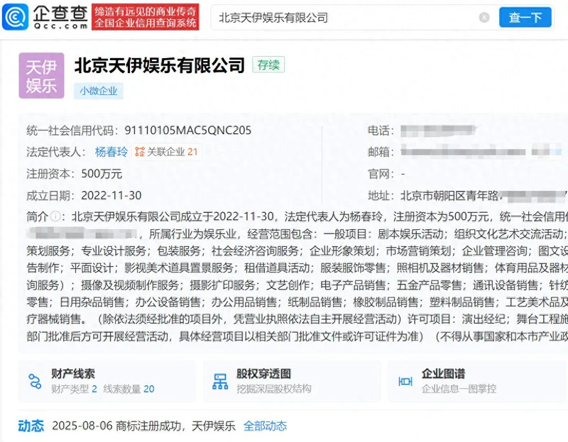 企查查APP显示,北京天伊娱乐有限公司成立于2022年11月,注册资本为500万元,经营范围包含剧本娱乐活动、组织文化艺术交流活动、演出经纪、电影发行等,杨幂母亲杨春玲任法定代表人、经理,并持股60%,为该公司大股东及实际控制人。值得注意的是,北京天伊娱乐有限公司与上海杨幂文化工作室共用一个邮箱和电话。