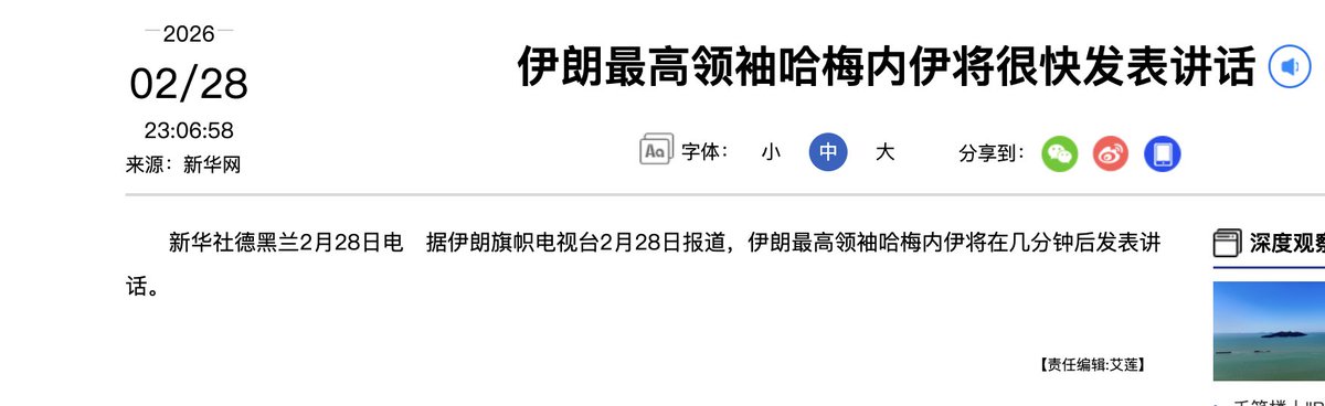 新华网在北京时间2月28日晚上11点左右说:哈梅内伊将在「几分钟后」发表讲话。现在时间已经过了近两个小时,怎么还没见哈梅内伊露面?
