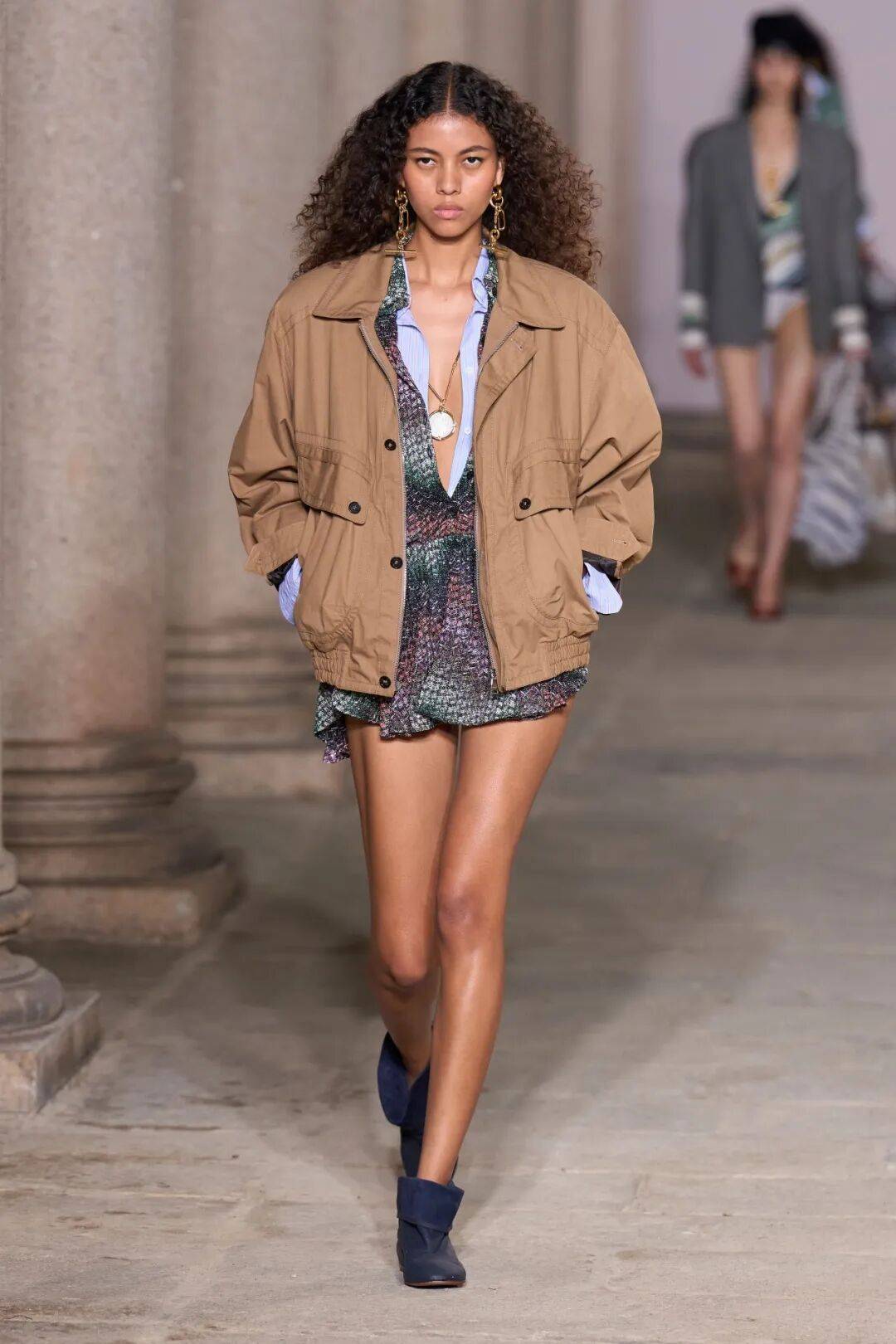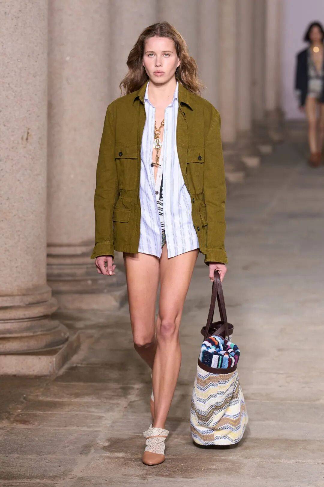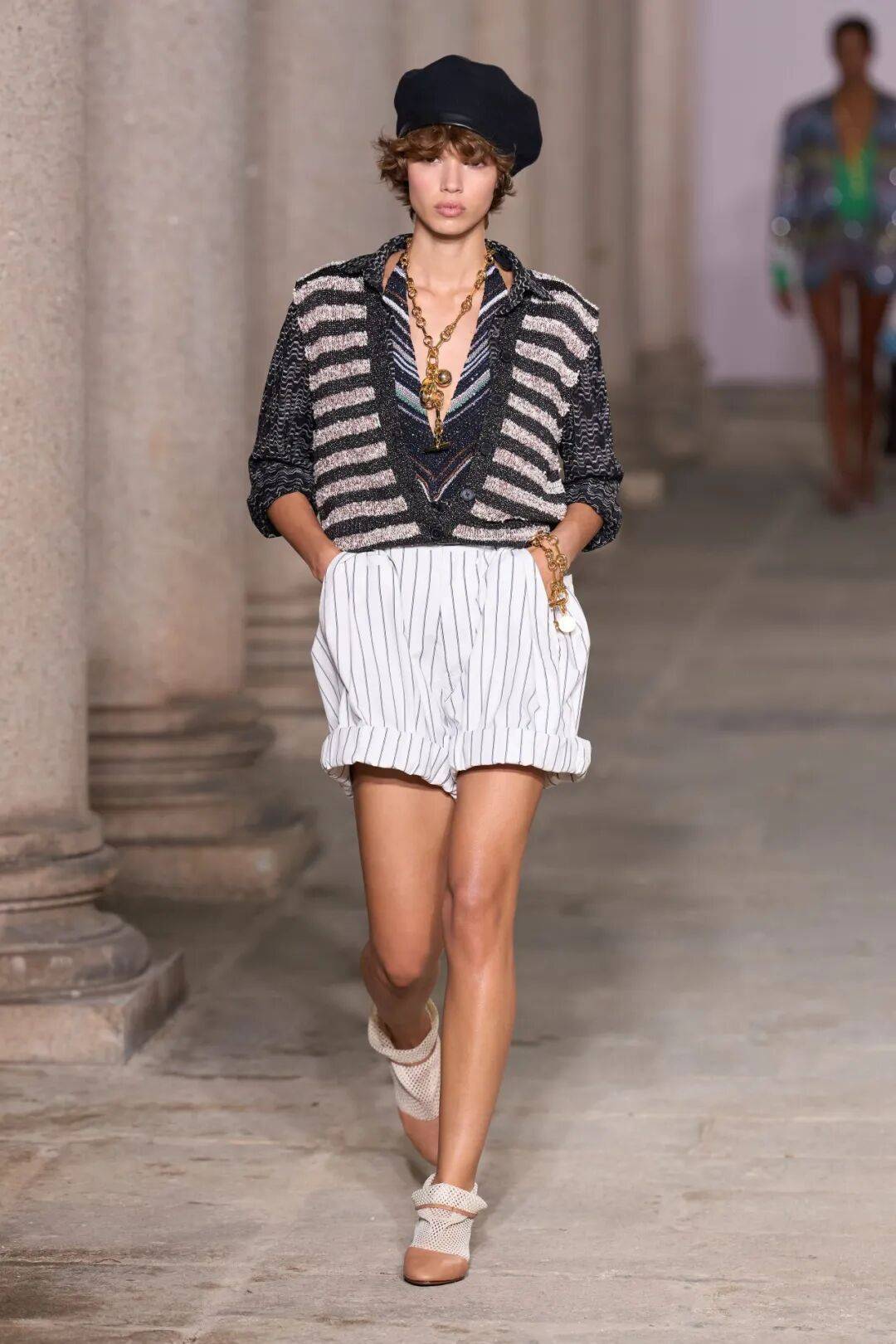 最惊艳的是亮片与金属线的融入——不同于普通亮片的生硬堆砌,Missoni用独家针织工艺,让亮片“呼吸”起来。金属丝混纺进针织与雪纺,光线扫过,面料泛出细碎的珠光,像阳光洒在海面上的粼粼波光,温柔又闪耀,白天不浮夸,夜晚够吸睛。