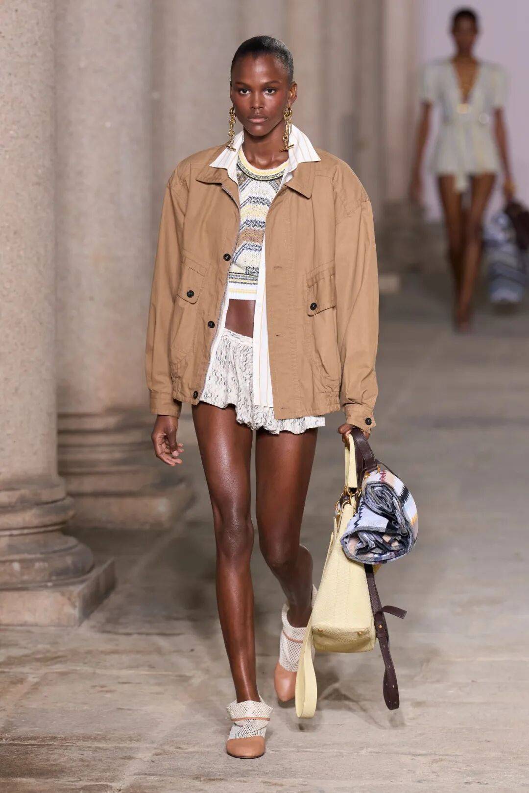 秀场没有人造沙滩,却用面料与廓形,把地中海的阳光、微风、松弛感织进每一寸设计。没有夸张的海洋印花,却让金属丝混纺的针织在光影里泛出海浪的碎金;没有刻意的度假符号,却用卷边短裤、比基尼内搭、宽松开衫,把“随时放松”的态度穿成日常。这不是为旅行而生的服装,而是为现代女性的多元生活而生——自由,从不被场景定义。