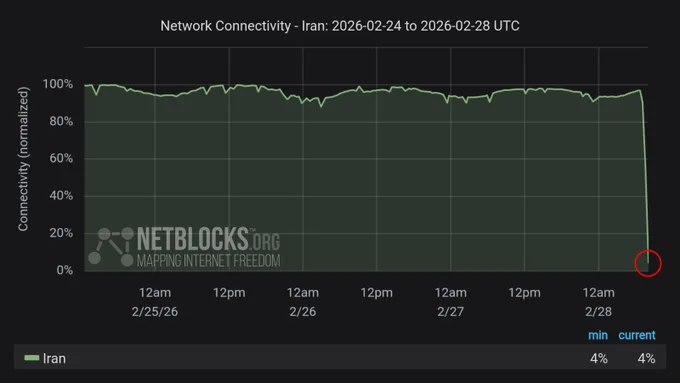 2月28日,伊朗正遭遇近乎全面的网络中断,互联网连接率已降至正常水平的约4%。