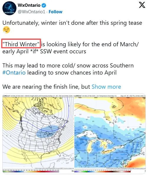 安省南部可能会迎来气象学家口中的“第三个冬天”——寒冷气温和降雪可能会一直拖到3月,甚至延续到4月。
