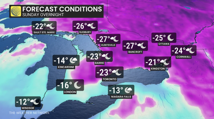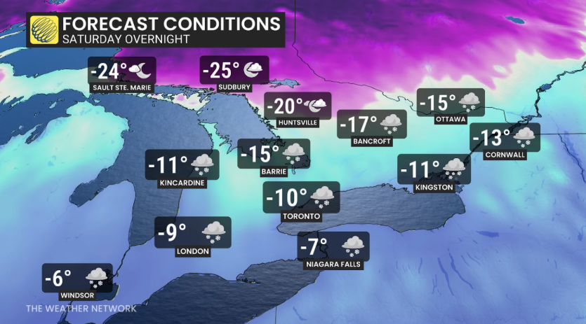 多伦多周六傍晚气温将从-6°C降至周一早晨的-18°C,这是自2015年以来三月最冷的温度,体感温度低至-25°C。