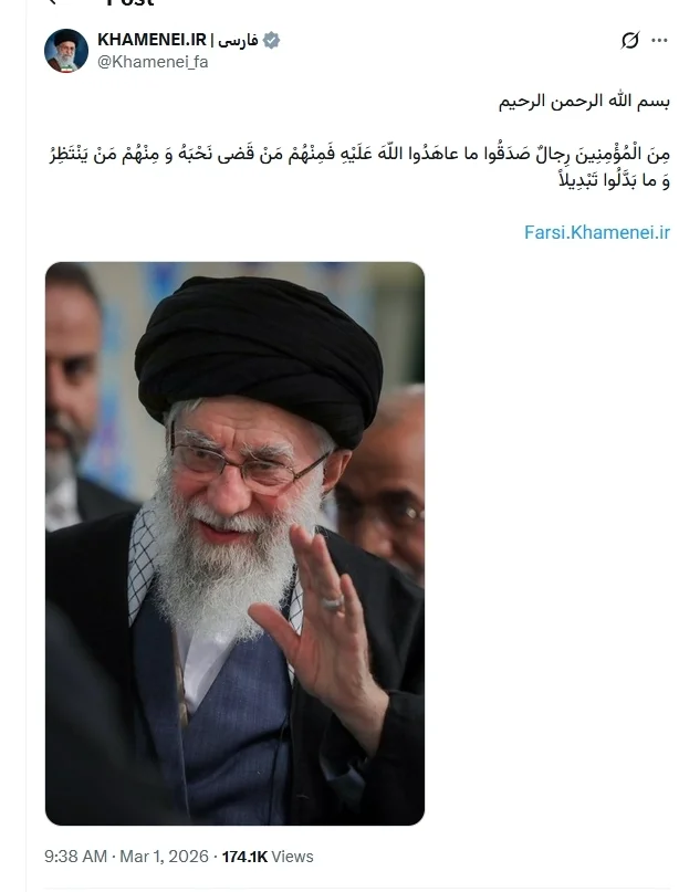 伊朗(专题)官方媒体证实最高领袖哈梅内伊身亡后,哈梅内伊的官方社交媒体发帖。 帖子说:“奉至仁至慈的真主之名,信徒中有些人始终信守与真主的盟约。他们中有些人已经履行了誓言,有些人仍在等待。他们丝毫没有改变它。” 美国和以色列(专题)2月28日联手打击了伊朗,美国和以色列早前都宣称伊朗最高领袖哈梅内伊已在袭击中身亡。伊朗国家媒体3月1日发文称,伊朗最高领袖哈梅内伊遇害。他是在办公室遇袭身身亡的。