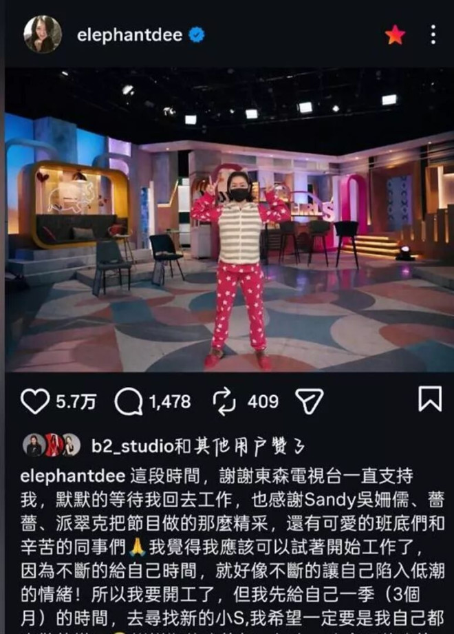 这次回归,小S显然不想只是“回到过去”。 早在2月13日,她就穿着红色波点睡衣现身《小姐不熙娣》摄影棚,坦言自己发现“不断地给自己时间,就好像不断地让自己陷入低潮的情绪”,于是决定不再沉溺,主动“开工”。 她给自己设定了一个三个月的“寻找期”,目标明确:“去寻找新的小S,我希望一定要是我自己都喜欢的样子。 ”节目组为此专门打造了《主持复健之路》特辑,协助她以“一张白纸”的心态重新适应。