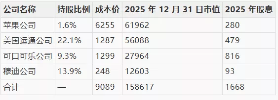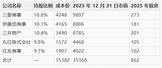 截至 2025 年末,上述美国和日本企业的持仓市值合计 1940 亿美元,占公司 2978 亿美元股权投资组合的近三分之二;2025 年合计产生股息 25 亿美元,以 245 亿美元的原始成本价计算,股息收益率达 10%。