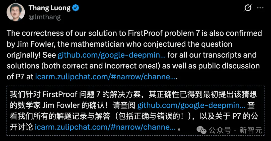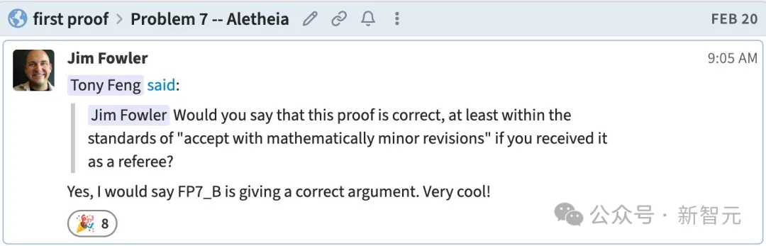 结果,Aletheia不仅自主算出了答案,甚至连提出其中第7题猜想的数学家Jim Fowler本人,都亲自出面盖章确认:「AI的解题过程,是完全正确的。」