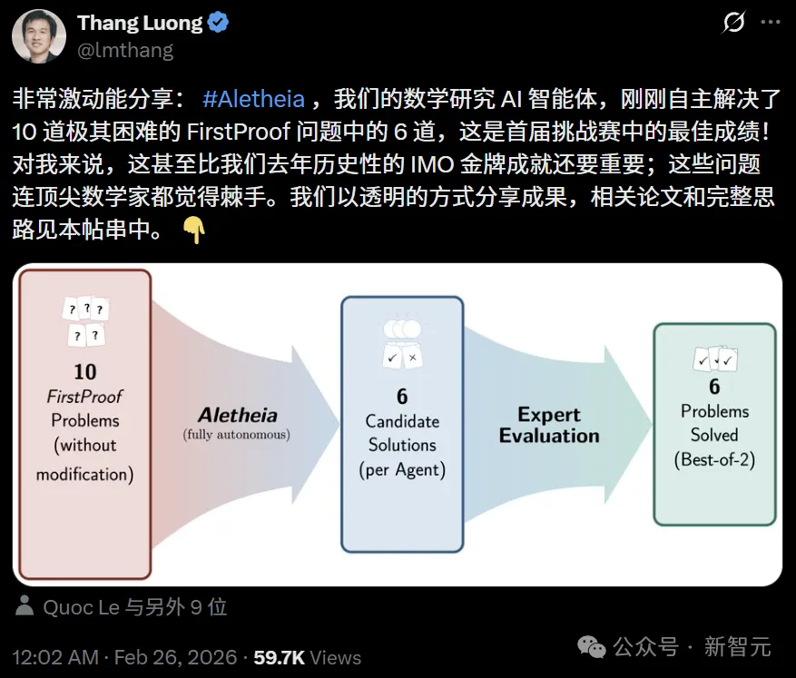 「超级激动!我们的数学科研AI智能体 #Aletheia,刚刚全自主解出了10道出了名变态难的FirstProof挑战题里的6道,直接拿下了首届全场最佳!」