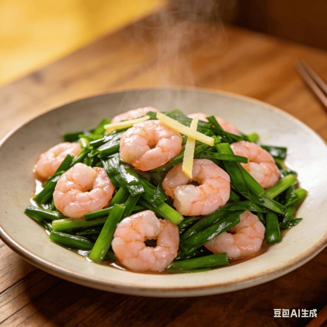 材料:虾仁300克,韭菜150克,生姜3片。(2人份)