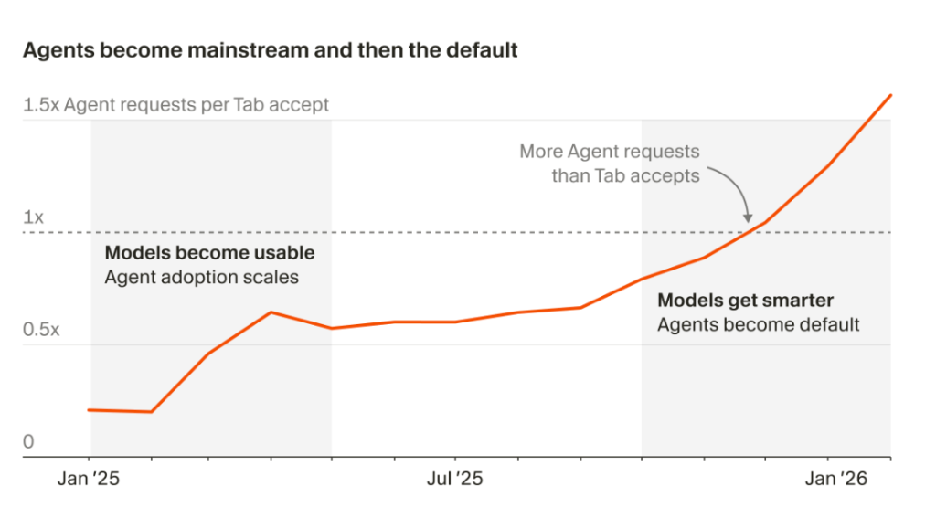 Cursor以自身内部实践为例,描绘了这一新工作模式的具体形态。采用新方式的开发者呈现出三个共同特征:智能体负责编写近100%的代码;开发者将时间集中于拆解问题、审查制品与代码、提供反馈;以及同时启动多个智能体并行推进,而非逐一手把手引导至完成。