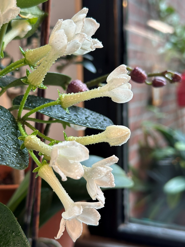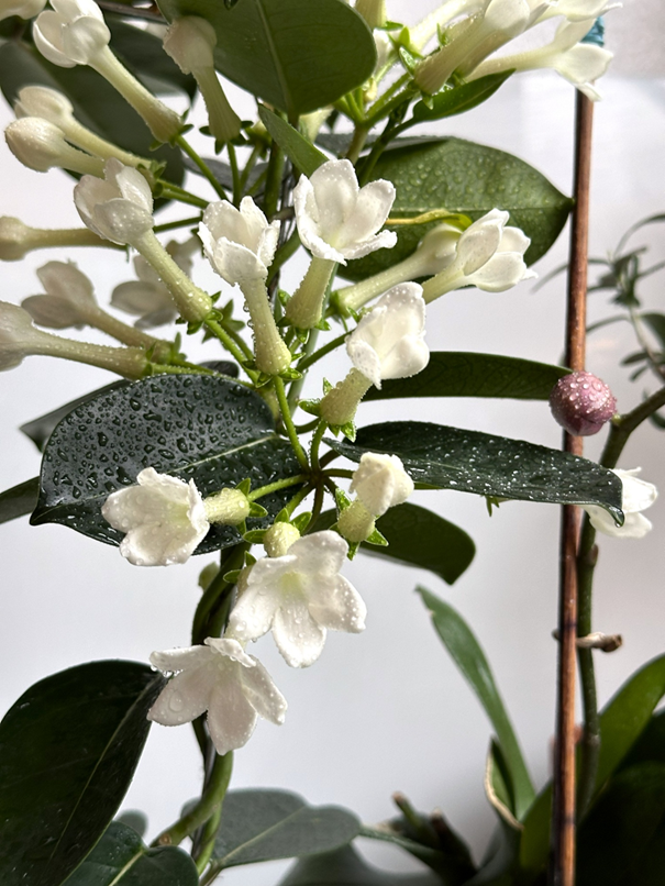 它的枝条像藤蔓一样延展生长,大的可以长到2米多,所以又叫 Stephanotis floribunda,一种藤属科的植物。花店经常会把它们扎成一个环状儿,作为装饰花来卖。