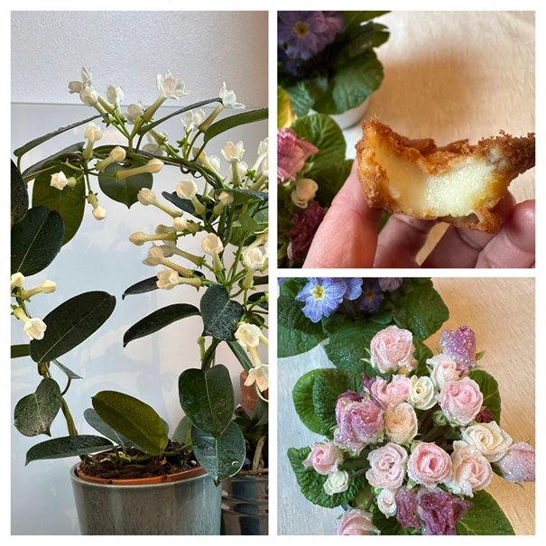 紧接着,先生马上说他要出门打球去了。我暗喜,我是很享受一个人的厨房时光的,尤其在这阴雨的周日,静静的,摸摸这儿,动动那儿,一切都慢了下来,只有花香奶香扑鼻沁人心肺。