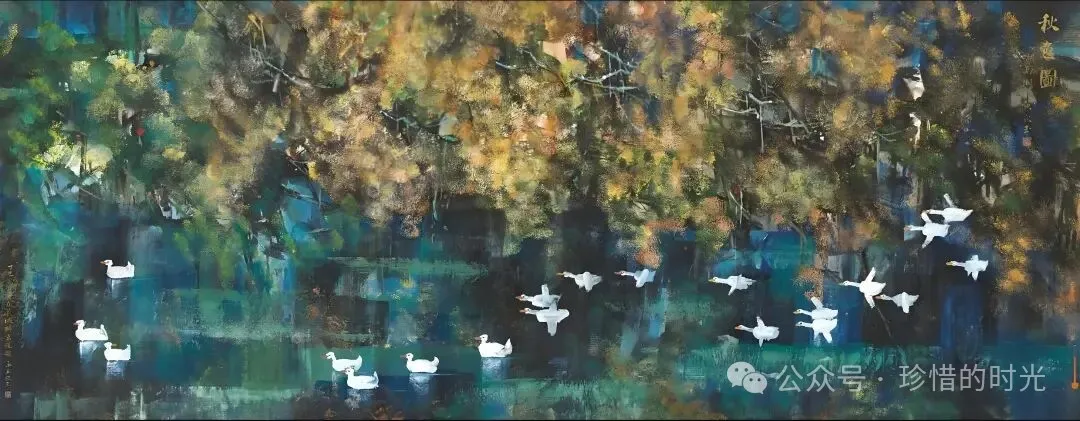 暖色调铺陈出秋的烂漫,白色的飞鸟澄净,浓淡相宜,自在洒脱,把人间秋色画得温柔又热烈。
