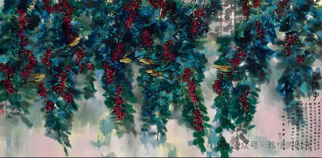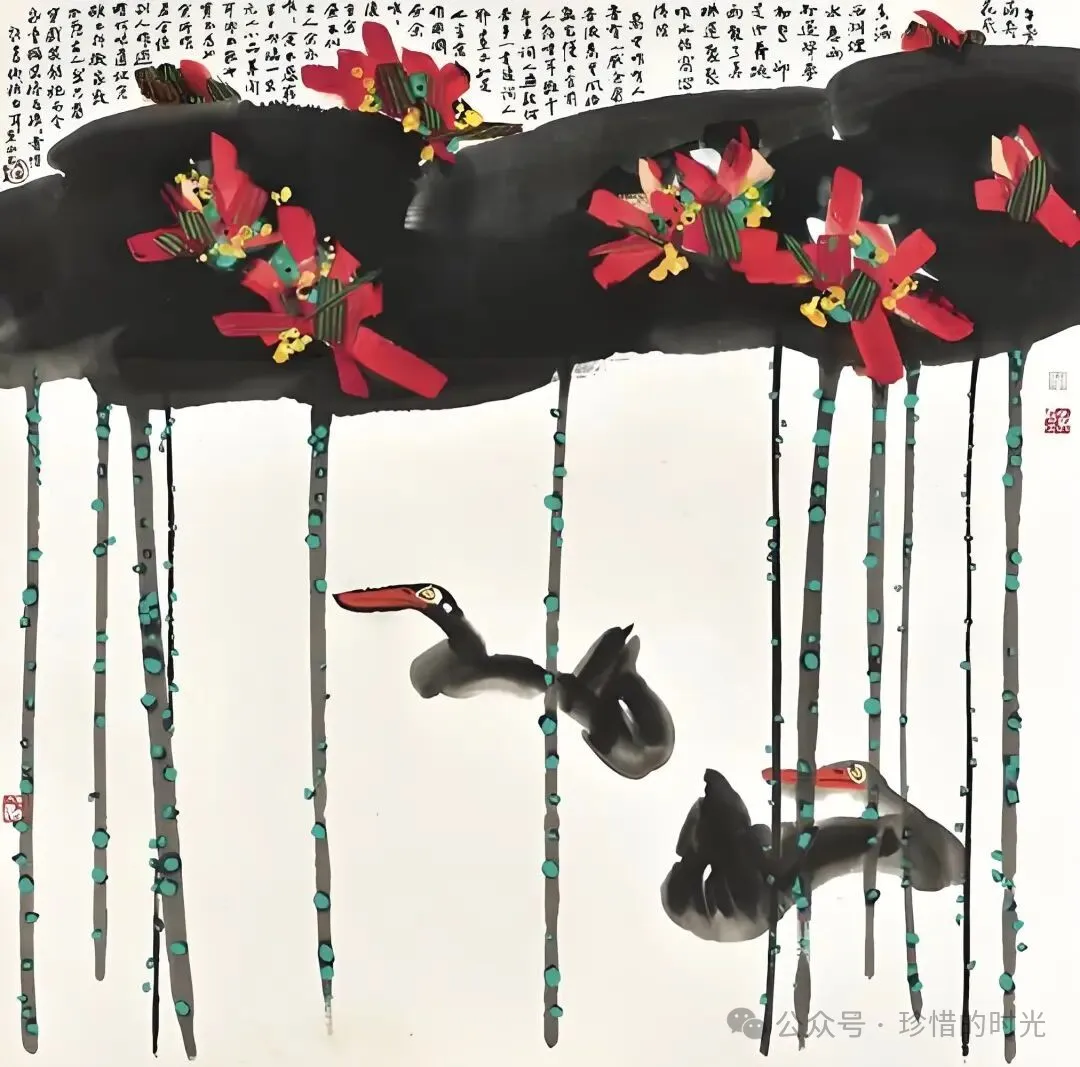 这一幅作品融合了故乡风物与艺术想象,画面充满生活气息与诗意,用笔松弛而富有张力,寥寥几笔的翠鸟仿佛会飞出画面。