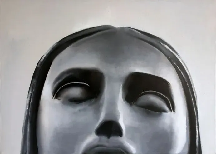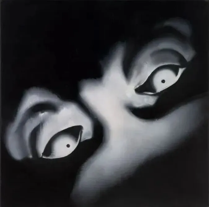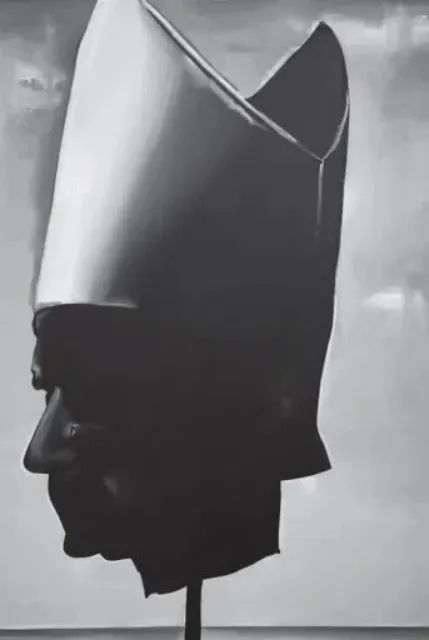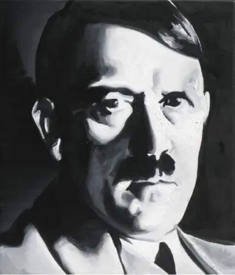 抽象绘画用单色表现的作品有很多,但在具象领域,用单色绘画的画家很少,真正画的好的画家也很少,而且艺术史上没什么标杆人物,因为那实在像取巧,严培明好像抓住了这么一个“漏洞”,在这一“漏洞”里越陷越深。其黑白体系更像一种固定手段,覆盖在所有题材之上,使得婴儿、政治人物、罪犯、骷髅,在视觉气质上高度雷同。有时也会使用单色的红色或蓝色这样的色调,可能是为了打破惯性或者为了内容的协调。例如画的伟人毛主席和1808年5月3日夜枪杀起义者等作品(图一,图二)。单色不再服务于内容,反而成为掩盖绘画语言单薄的掩护,让所有主题都被塞进同一套视觉模式之中。而且也几乎只是对原照片和戈雅原作进行的放大临摹,没有多少个人的主观处理。