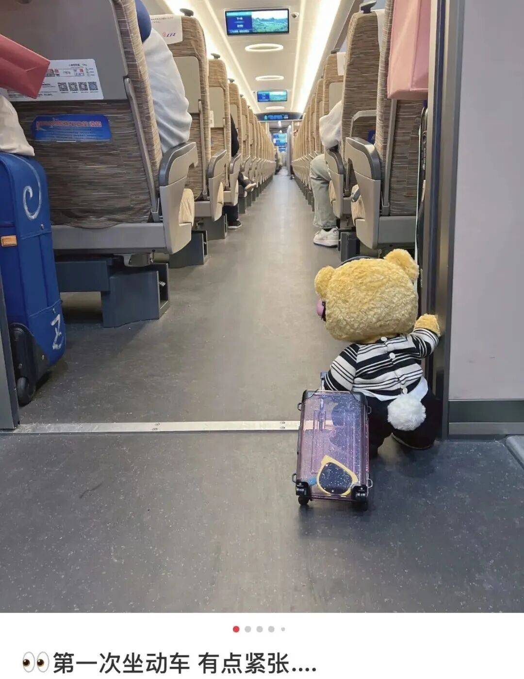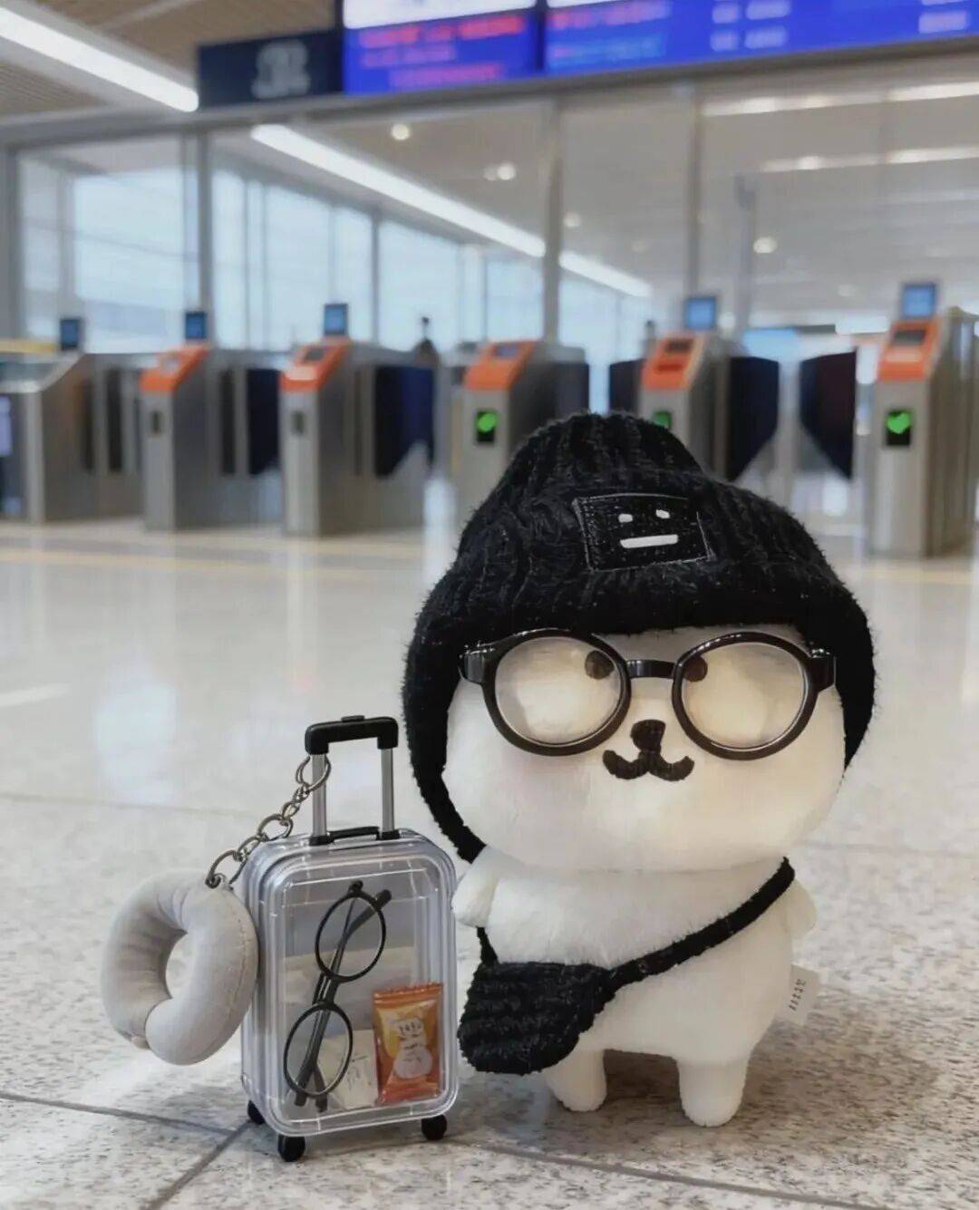 在出发的高铁站、车站、机场里,玩偶们拖着小小行李箱,向着未知的旅途蓄势待发。