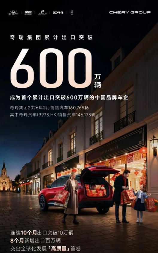 海外市场一直是奇瑞集团的优势领域。从2025年6月累计出口量超500万辆,到2026年2月累计出口量超600万辆,奇瑞集团仅用时8个月。