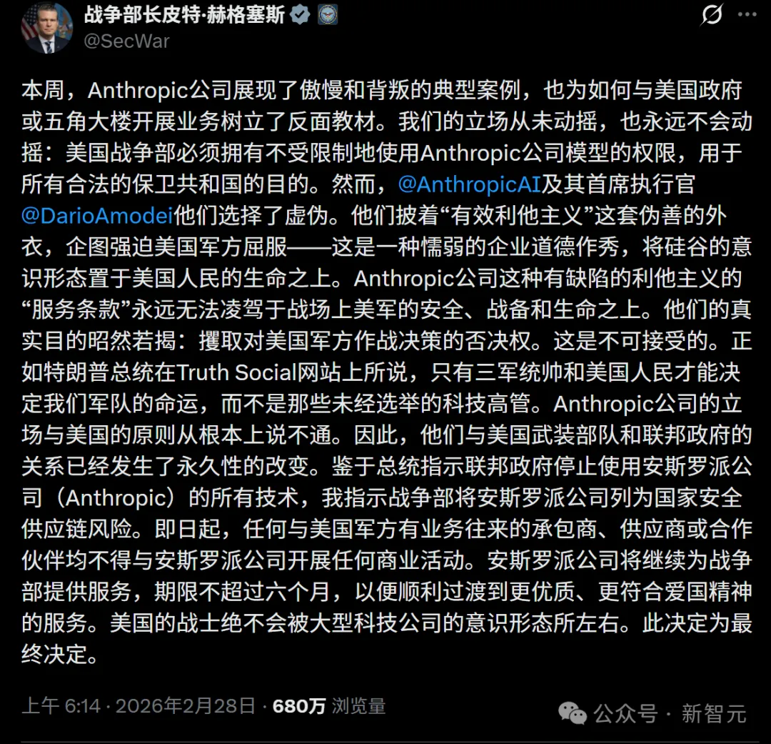 战争部部长 Pete Hegseth 更是火上浇油,不仅取消了去年 6 月签订的价值 2 亿美元大单,更以冷战时期的紧急权力相威胁,将 Anthropic 列为通常只针对外国敌对势力的「供应链风险」。