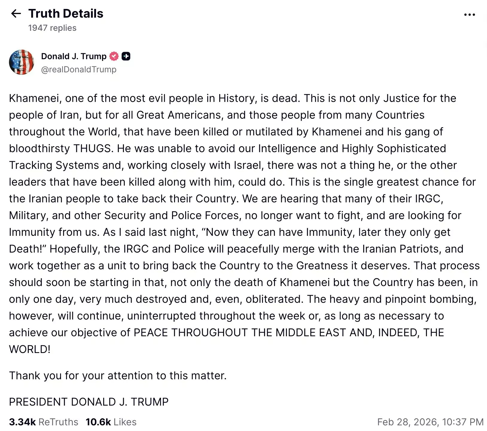 川普早前在Truth Social发文,指哈梅内伊是“史上最邪恶的人之一”。(Truth Social@realDonaldTrump)