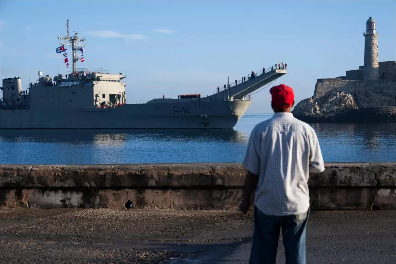 图为墨西哥军舰运送人道物资抵达哈瓦那湾。(法新社)